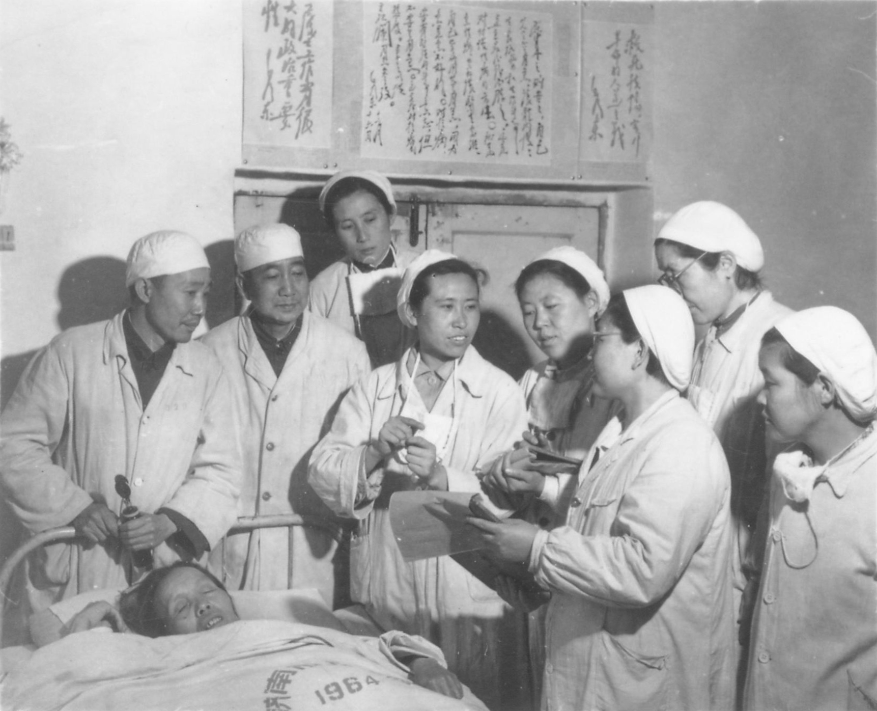 早在1959年云顶赌场app 就开展了角膜移植术,这是陈智慧大夫(前排右二)带领医护人员为角膜移植术后的患者查房