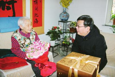 党委书记牟鑫手捧鲜花和生日蛋糕,带领离退休职工管理科工作人员到离退休干部、老专家、原妇产科主任刘漪同志家中,为老人家庆祝98岁生日。