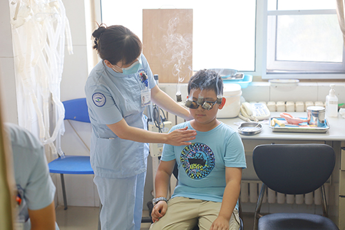 在干眼门诊,护士高聪聪为学生介绍干眼症的发病因素、预防和治疗的同时,护士赵欣现场为有眼部瘙痒干涩症状的学生进行“捉虫”检查,学生们看着在睫毛根部找到的正在蠕动的螨虫十分惊讶,纷纷表示一定会健康用眼,注意对眼部的清洁,千万不可与虫同行!