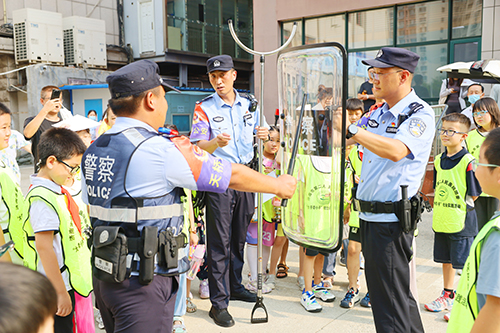 “做梦我都想骑一骑这帅气的警用摩托!”本次活动给八岁的男孩明明圆了一直以来的骑警梦。2号街面警务站站长吴超首先给孩子们介绍了出警车、警用摩托、盾牌、钢叉、催泪瓦斯、手铐的具体用途和基本使用方式,“铁骑”还进行了现场骑行展示,引来了现场学生们的阵阵叫好声。
