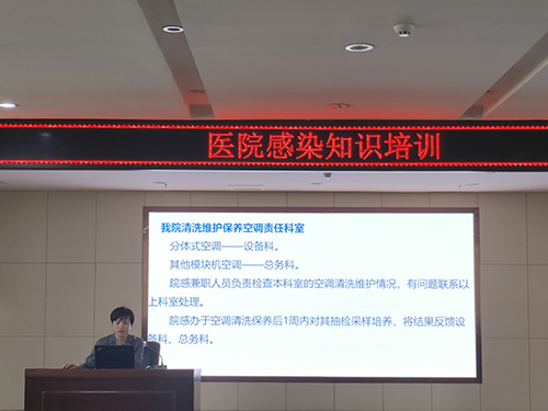 随后,院感办副主任杜敏作了题为《公共场所集中空调通风系统卫生规范》、《公共场所集中空调通风系统清洗消毒规范解读》的讲座,杜敏通过对规范的讲解解读,详细介绍了公共场所集中空调通风系统卫生规范、通风系统清洗消毒时机、消毒技术要求等方面内容。医院空调的清洁消毒是预防院内感染的重要组成部分,对保障医疗安全具有重要意义。讲座结束后对参会人员进行了答题考核。