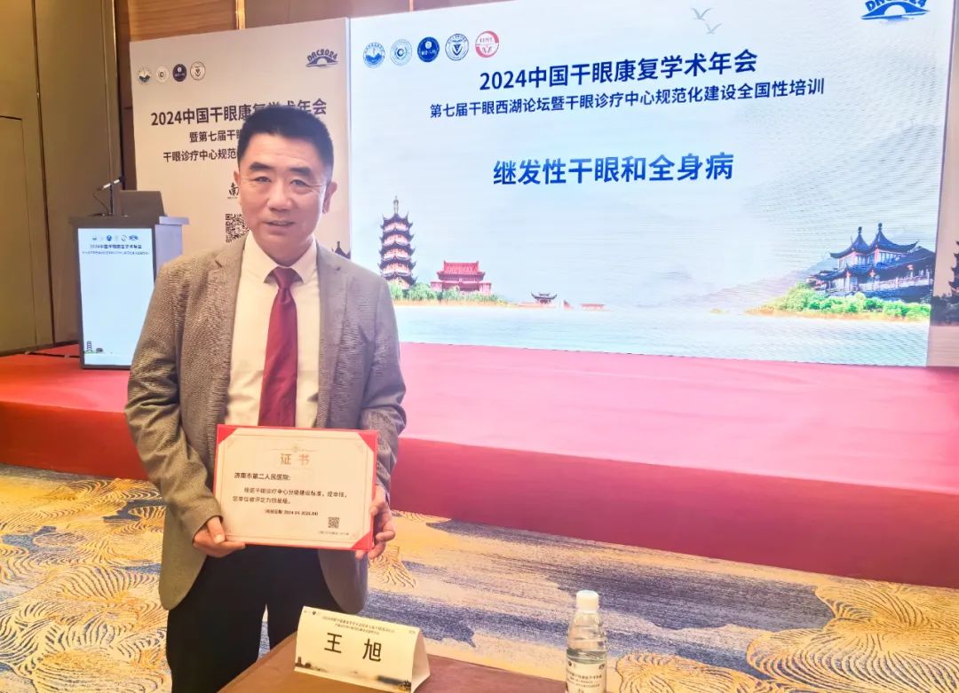 干眼门诊获评国家四星级干眼诊疗中心,市二院副院长王旭受邀领奖并作大会发言。