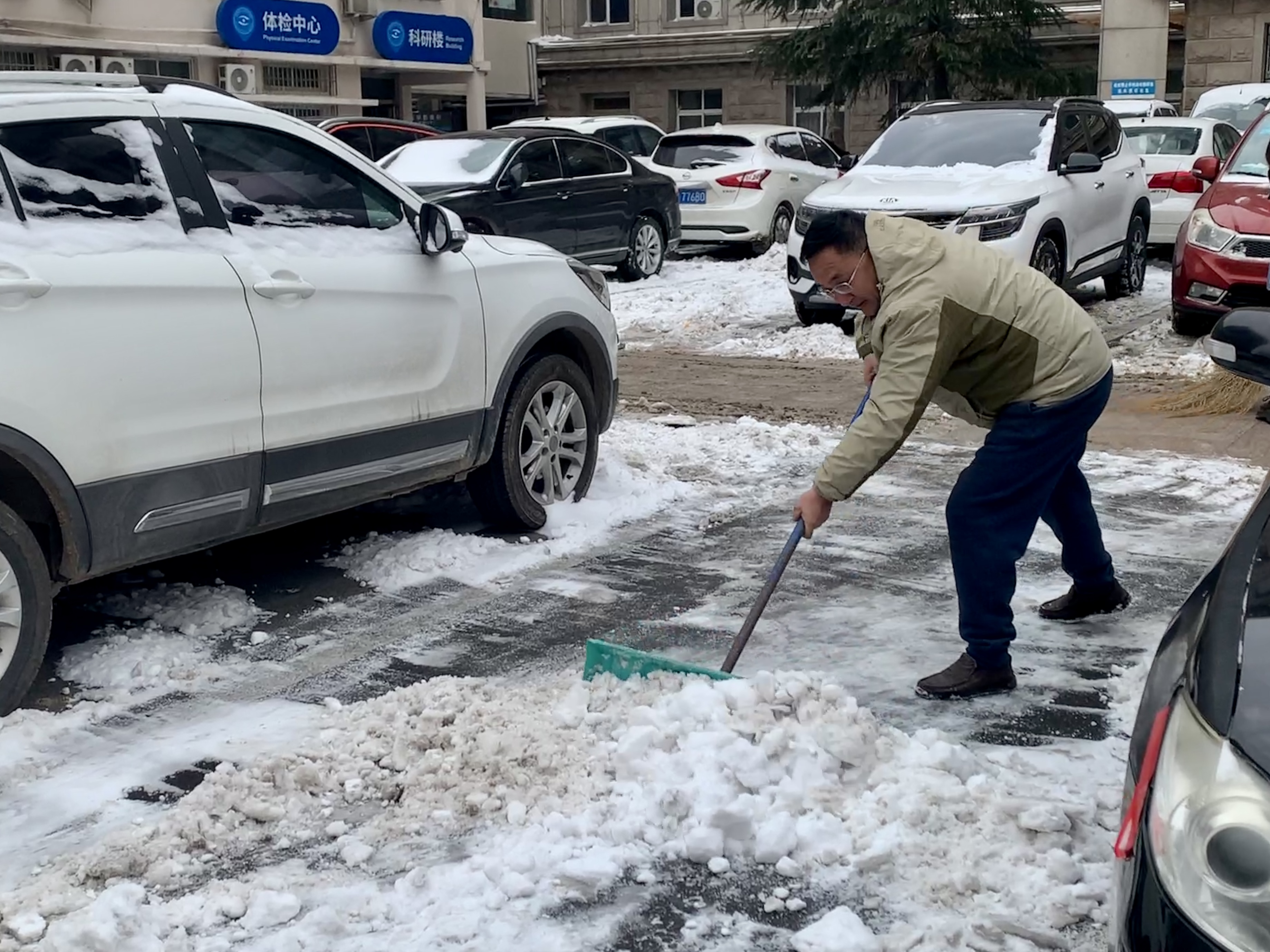 院领导清扫道路积雪