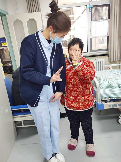 近日,45岁的包女士在亲友陪同下,从临沂前往市二院顺利实施了白内障手术。重见光明的她开心得像个孩子,她拉住护士们的手拍照留念。眼七科护士长王娟介绍说:“包女士是一位特殊的白内障患者,在5岁时因一场疾病导致身体和心智发育停滞,一直停留在5、6岁时的状态。本来生活可以基本自理,但就在两年前起,包女士的生活开始需要别人照顾,甚至一时一刻也离不开人,这让家人十分担忧,每次询问她哪里不舒服,包女士也说不出缘由,家人以为是她心智方面的问题又加重了,可又没发现其他异常。直到近段时间,包女士走路需要摸索着走,这才发现是眼睛出了问题。于是,包女士的家人就带着她到医院进行检查治疗。由于包女士从小就害怕打针、害怕医院、害怕医生护士。无论家人如何劝说,在医院里她始终哭闹着不肯配合。”医生护士像哄孩子一样,耐心安抚着才完成了初步检查,大致确定为双眼白内障。可她的抵触情绪给进一步治疗带来了极大地困难。