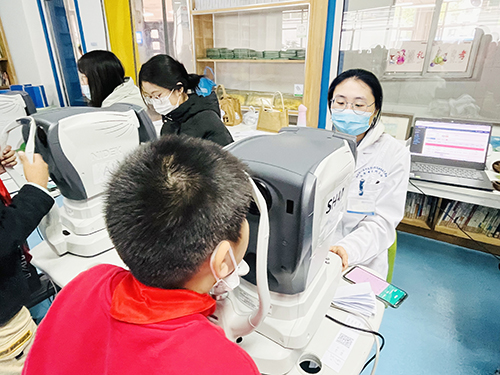 当天一早,志愿者团队按时抵达了济南市育晖小学,为全校学生开展了视力和验光等项目的检查。检查过程中,针对孩子们提出的关于用眼方面的问题,医务人员都一一耐心解答,详细指导孩子如何科学用眼护眼,督促他们改正不良的用眼习惯,提早预防儿童眼病的发生。