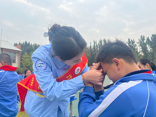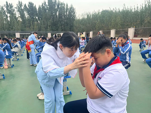志愿者为学生纠正眼保健操动作