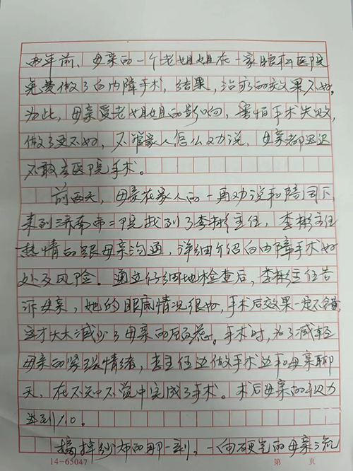 张大娘的女儿在信中写道:“五年前,母亲患上白内障,视力越来越不好,我们一直劝母亲去医院做手术,但由于母亲外地的一个老姊妹几年前因为眼睛问题在当地做手术没有成功,最后导致失明,给母亲留下了心理阴影。母亲是胆小的人,她也害怕是这样的结果,所以就特别的排斥做手术,生怕手术不成功却失去了现有的光明。母亲的视力几乎不能看清东西,曾经去过几家医院治疗,都因母亲的担心和顾虑没有得到有效治疗。后来,在家人的一再劝说下又才勉强同意来到云顶赌场app