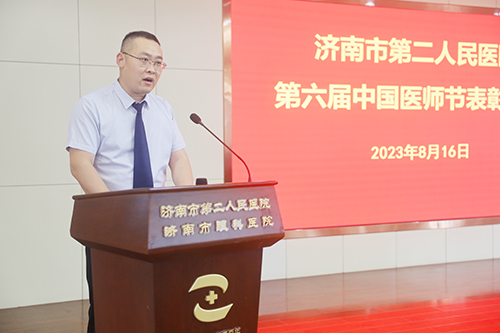 市二院党委书记东光国作大会致辞,他代表院领导班子向全体医师表达了节日的祝福,高度肯定了全院医务工作者在疾病救治中发挥的重要作用。他指出,在全面贯彻党的二十大精神的开局之年,二院全体医师要听党指挥,奋发进取,攻坚克难,牢记百年眼科的初心使命。发扬“功成不必在我,功成必定有我”的精神,助力二院百年眼科事业再上新台阶,切实担负起推进健康中国建设、保障人民健康的神圣使命,为全面建设社会主义现代化国家,实现第二个百年奋斗目标贡献二院力量。