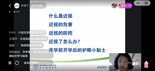 8月25日至29日,市二院中医眼科巾帼文明岗分别通过睦和苑社区及市计划生育协会网络直播平台,在线开展了暑期家长护瞳课堂活动。中医眼科副主任、副主任医师宿艳以在线直播的方式,向广大家长讲解了儿童青少年近视防控相关知识,在全社会营造爱眼护眼的浓厚氛围。