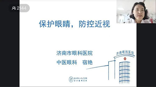 “护瞳行动”眼科专业团队受邀参加了市计生协会开办的“济南市家庭健康促进行动大讲堂”。医院两位眼科知名专家聚焦儿童眼健康,通过公益直播的形式开展了“爱眼日”专场健康科普讲座,向广大家长朋友普及了儿童青少年近视防控相关知识。6日上午10点整,直播正式开始。斜弱视及小儿眼病专业主任、副主任医师傅特为学生家长进行了主题为“儿童青少年近视预防”的健康讲座。 他围绕眼球的构造、近视的发病机理和危害、近视的矫正与预防、以及视力筛查操作技术等方面做了精彩讲解。傅特主任指出,家长作为儿童近视防控的“第一责任人”,应在家中为孩子创造有利于保护视力的学习生活环境,严格控制孩子近距离用眼的时间,及时纠正不良的用眼卫生习惯,合理安排孩子的膳食营养,保证孩子每天保持适当的户外活动,有效预防近视的发生或控制近视的进展。在接下来的直播中,由中医眼科副主任医师宿艳担任主讲,为家长朋友们线上生动讲解了“近视眼的危害及中医药预防”相关知识。她从中医专业角度,先后介绍了针灸、推拿、艾灸、压豆等一系列外治疗法,倡导家长运用中医特色手法保护儿童视力,预防并控制近视的发生与发展。随后,两位专家在线为学生家长解答近视防控相关问题,本次直播收看人次达2000余人。