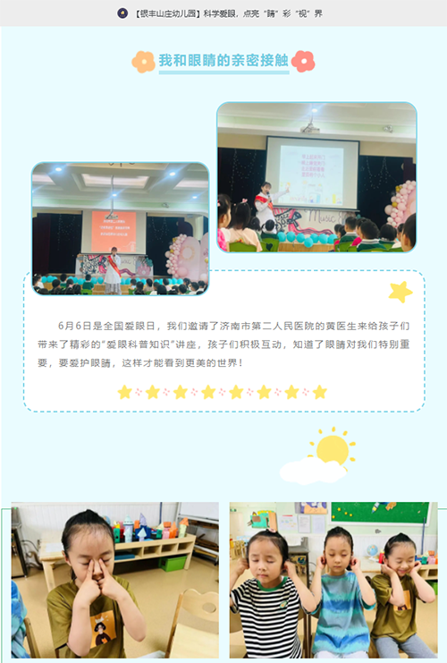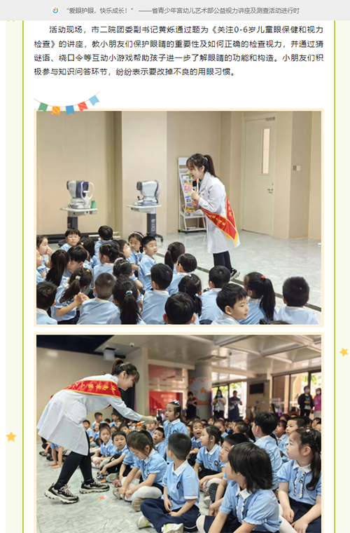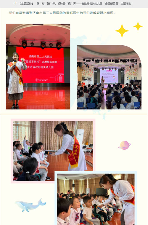 “近视早防控”青年志愿服务项目走进山东省青少年宫艺术部、山东省政府机关幼儿园、银丰山庄幼儿园等十余家幼儿园,为1000余名小朋友送去了专业的视力检查和眼健康讲座,并获得广泛好评。