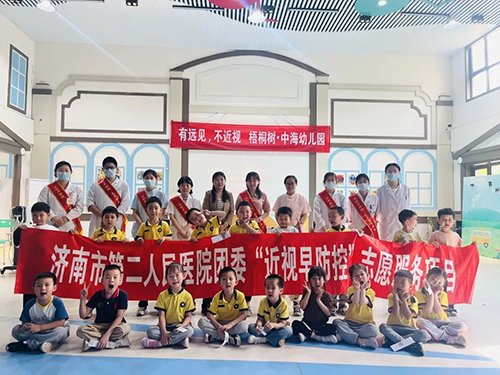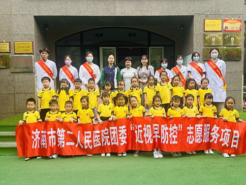 团委创建、济南市儿童青少年近视防控中心全员参与组成,注册志愿人数36人,其中青年志愿者所占总人数的 83.3%。“近视早防控”青年志愿服务队拥有专业筛查队伍6支,均为专业眼科医生、验光师,配备全自动电子视力表40余台,尼德克验光仪20余台。该志愿服务队通过发挥眼科医务工作者专业优势,针对近视低龄化问题开展早发现、早预防、早控制工作,以幼儿园、中小学为基地,广泛开展眼健康宣教、视力筛查、学生视觉健康建档等工作,初步建立起医院、校园、家庭三方联动的近视防控格局。