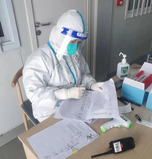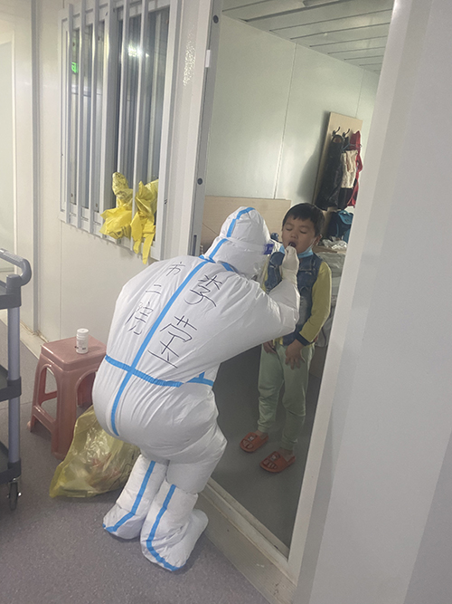 2022年4月份,李莹积极响应上级号召来到槐荫区方舱医院工作。战斗在入仓的第一时间打响,经过72小时不眠不休的工作,11个舱段迅速满员,方舱医院第一时间就收治了300人。此刻,李莹的双脚已经严重浮肿,每次走路脚像针扎一样。由于长时间身着高温闷热的防护服,加上不能及时进食补水,出现了尿路感染、湿疹、低血糖、头晕等症状。实在累得走不动了,李莹就和队友就地躺下歇一口气,休息片刻后立马起身继续工作。队友们都打趣说,能正常吃上三餐饭,睡上三四小时的觉,就觉得是一种“奢侈”。