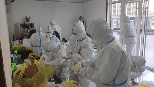 这是一支团结奋进的队伍。同志们互帮互助,并肩战斗,党员中层干部发挥了重要的带头作用。张晓越、刘静文、贾茹三位护士长,组人科谭思琪、心电图室解品吉等同志采样工作经验丰富,既是技术骨干也是管理骨干,他们检查并协助队员规范穿脱防护服,主动带队前往高危社区。王曦、刘师舜两位科主任带领男队员们抢着“承包”了老旧居民小区的入户采样任务,“征服”着一座座没有电梯的居民楼。