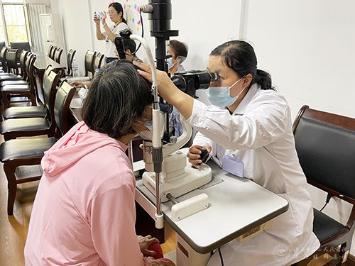 志愿者用裂隙灯为社区居民检查眼睛