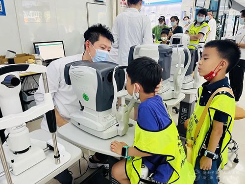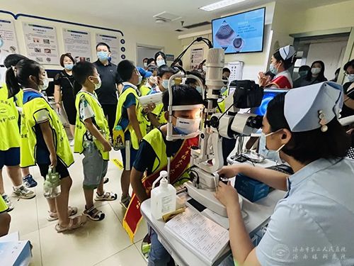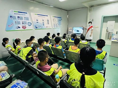 小儿眼病门诊的验光师司广清向学生们介绍儿童青少年的常见眼病、近视、远视的危害,造成儿童青少年近视的常见原因及如何预防近视保护视力,并带领学生参观体验眼科门诊的各种先进设备。