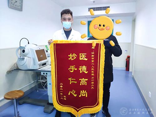 ,为眼内科主任陈璇、眼科特检科医生石叶强分别送上了写着“术精岐黄、光明天使”,“妙手仁心,医德高尚”的锦旗。小黄说:“市二院的眼科医生医德高尚、医术高明,挽救了我的视力,治疗效果超出了我的预期。”