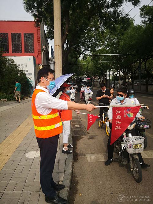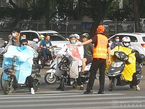 “请您后退稍等”,“请您走斑马线!”在经四纬六路路口的非机动车道斑马线处,志愿者们时刻提醒过往行人注意交通安全。他们着装整齐、精神饱满,在烈日炎炎下出满勤站满岗,在早晚交通高峰时段,为市民开展了交通秩序维护、文明出行劝导、交通导引咨询等志愿服务。一位过路的行人说:“看到志愿者在指挥交通,本来有闯红灯的想法也就打消了,为我们的志愿者点赞!”