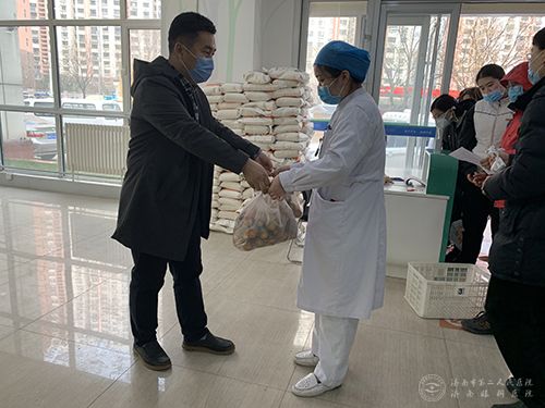 当他了解到周家村合作社种植的糖心胡萝卜因疫情存在销售困难后,主动向医院党委汇报情况,得到了医院的大力支持。他又马不停蹄地联系了姑寺张村的大西红柿,路家村的石墨面粉等农副产品,组织了多次“共同抗疫·爱心助农”活动,在餐桌和大棚之间,架起了一条“物流直达通道”,4000余斤农副产品被职工一抢而空,既丰富了职工“菜篮子”,又填满了农民“钱袋子”。