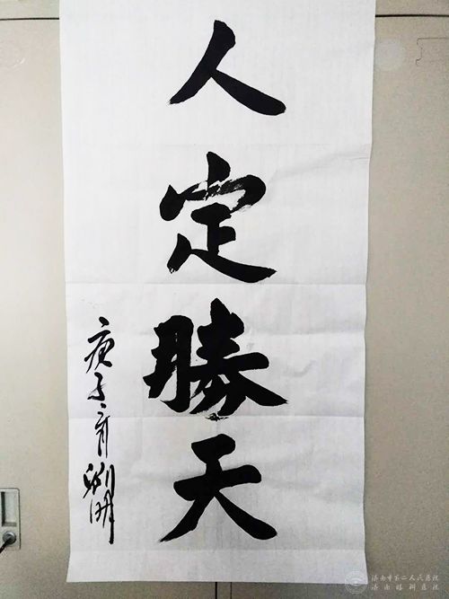 中药房刘明提笔手书“人定胜天”四字,运笔自然流畅,笔法遒劲有力、气势滂沱,写出了在党中央的坚强领导下,全国人民万众一心,众志成城,共克时艰、战“疫”必胜的坚定信念和决心,同时也为冲锋在前、逆行而上的白衣天使们加油鼓劲、呐喊助威。