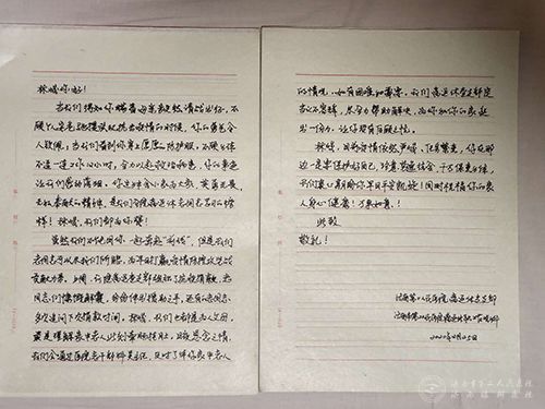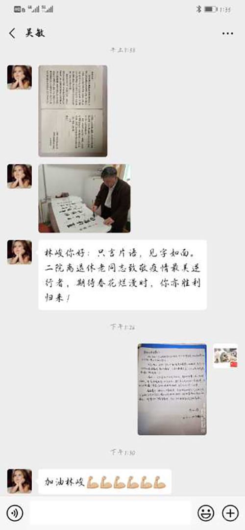 虽然退休在家,但老同志们时刻关注着医院抗击疫情的工作情况。为支援湖北人民抗击疫情,院党委号召全院职工筹集善款,离退休职工管理科在群中转发倡议,老同志们纷纷慷慨解囊,奉献爱心。主动请缨,英勇奔赴武汉一线的医院护师李林峻,也牵动着每位离退休职工的心。离退休职工管理科及时汇总这位“逆行者”的先进事迹,并通过微信群转发给老同志们。看到了李林峻的抗疫事迹,大家都为她“舍小家为大家”的精神所感动,纷纷点赞。离退休党支部代表老同志们书写了“致林峻的一封信”,为她加油鼓劲,字里行间充满了浓浓的真情和正能量。有的老同志还以书法的形式,抒发了对这位“战疫天使”勇敢无畏、舍己为人精神的钦佩和赞扬。