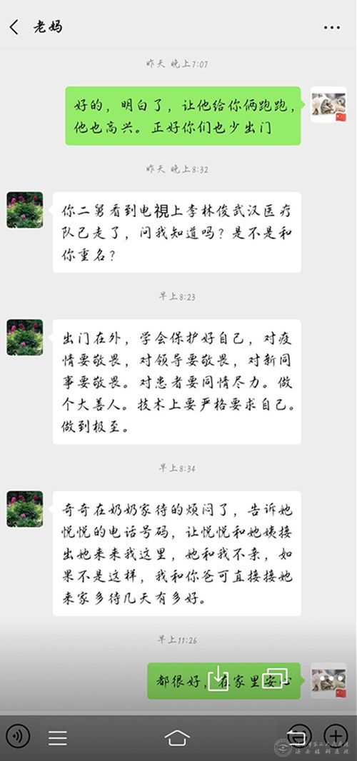第二天一早,妈妈又发来短信“出门在外,学会保护自己,对患者要同情尽力。做个大善人。技术上要严格要求自己,做到极致。”一位74岁的老人,戴着花镜,用颤抖的手,一字一字地敲出了这简单的几句话,饱含的却是一位母亲对女儿深深的嘱托和牵挂。