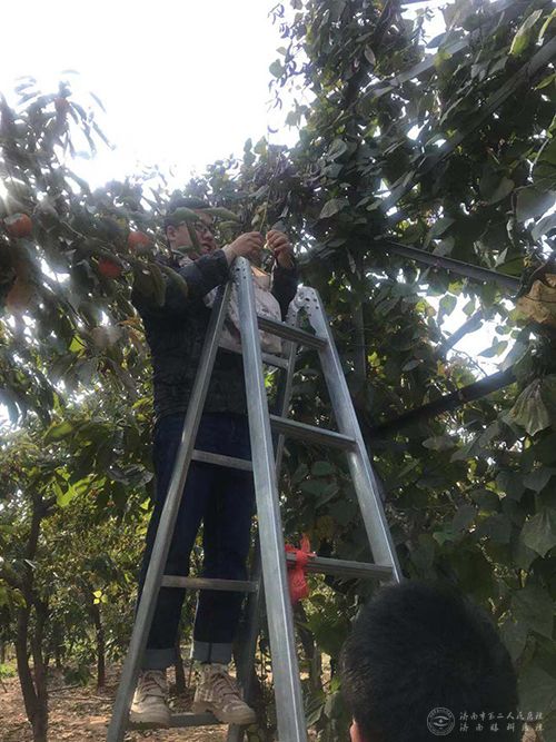 随后崔主任带领大家来到大赵村的12号柿子基地,帮助当地村民采摘丰收的柿子。一下车,映入大家眼帘的是一片片满树珠珠串串挂枝头的柿子,橘黄色的柿子像一盏盏小灯笼挂在深秋的田野里,格外引人。大家抑制不住兴奋,不顾旅途劳累,3-5人一组,有的爬上柿树采摘高处的果子,有的站在梯子上采摘中部的果子,有的伸手采摘底处的果实,忙得不亦乐乎,不一会一大堆柿子像小山一样堆在地头。村民们高兴合不拢嘴,连连道谢。