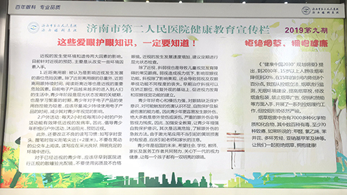 济南市二院在门诊大厅,专门设置了关于戒烟、眼病小知识、预防儿童意外伤害等相关内容的健康宣传栏,并结合夏日眼部感染几率增大的实际情况,发布了医院眼科专家总结出的“夏季应预防的5种眼病”,得到就诊患者的关注和好评。在设置宣传栏的同时,医院还在门诊设立咨询台,提供预防眼部疾病健康咨询,并现场发放戒烟、护眼的相关宣传资料,宣传健康生活方式。