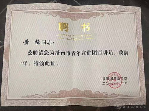 2018年12月13日-14日,全市共青团青年宣讲骨干培训班开班,来自全市各行各业的60名优秀青年典型和青年宣讲骨干参加本次培训。培训班上,济南市第二人民院宣传科黄烁被共青团济南市委聘任为济南市青年宣讲团宣讲员。