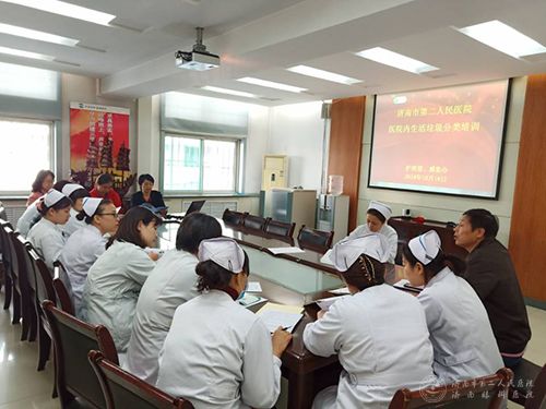 据济南市政府办公厅关于印发《济南市生活垃圾分类工作总体方案(2018-2020)》的通知,按照卫计委工作部署要求,10月18日下午,云顶赌场app 护理部、感染办、总务科联合开展了医院内生活垃圾分类专题培训工作,全院护士长及保洁公司负责人参加了培训。