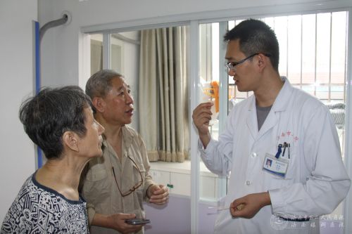 一楼导医台,向医护人员诉说98岁的老母亲眼睛不适,但因为腿脚不便无法来院就诊,希望医院能够派大夫上门为老人看看。医院门诊部了解到这一情况后,立即调配人员、器材、药品、车辆,一支3人组成的医疗队迅速赶往老人居住的护理照料中心。