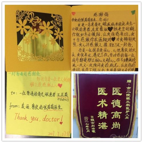 这是一封精致的感谢信,稚嫩的文字字里行间都在感谢他口中的“美丽善良的张苗苗医生”,初看以为这一定是一位小患者,其实这是一位患有急性闭角性青光眼的老奶奶。治疗出院后,回想起发病时的疼痛难耐和住院时眼三科的大夫护士们对她的耐心劝导和细心照顾,让她心生感激,特意让小孙女代笔来写了这样的一封精致的感谢信,并且又亲自送回到之前住院的眼三科。她说:“我本以为只有老大夫才能心平气和的理解体会我们这些老家伙们的痛苦,没想到啊,你们这的娃娃们也都这么细心这么贴心,都是好孩子啊!”