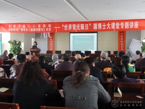 在做好临床工作的同时,眼三科的姐妹们还承担了大量的社会志愿服务工作,组织人员参加“眼博士公益电话门诊”的答疑释惑工作;承接济南市残联的眼科伤残鉴定工作,并承办济南市残联“集善青光眼项目”;参加山东经济广播组织的“眼博士大课堂”活动,受邀做客齐鲁电视台、济南电视台的科普宣教节目;积极参与“光明手杖”低视力人群宣教帮扶活动,为因眼病和外伤造成低视力的人士及其家属提供心理辅导和行为宣教;投身“送爱到乡村”活动,为留守老人和儿童进行体检,并送去免费的眼药水;参加“专家进社区,健康大学堂”活动,为社区居民进行讲课和查体;每年的“世界青光眼周”、“世界盲人节”、“全国爱眼日”,科室还会通过各种形式进行青光眼防治知识的宣教。王建荣还在微信平台开辟了“光明讲堂”、“青青世界”、“从医随笔”等公众号,很好地普及了健康知识,得到社会和群众的一致认可和广泛好评,赢得了良好的社会效益。