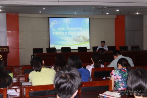 召开创城工作推进会暨学雷锋志愿者文明规范培训,院党委书记牟鑫出席会议并讲话,医院职能科室全体人员及导医台工作人员参加会议。