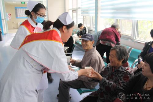 志愿者们为门诊的老人送上一杯暖心的热茶