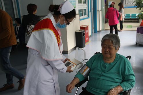 志愿者为候诊的老人测量血压