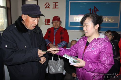 工作人员发放宣传册材料