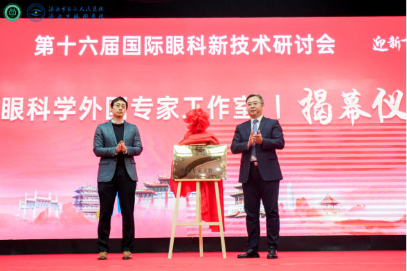在揭牌仪式上,市眼科医院(市二院)党委书记东光国和美国明尼苏达大学眼科学与视神经科学系角膜病专业主任Joshua Hou副教授共同为济南市眼科学外国专家工作室揭牌。