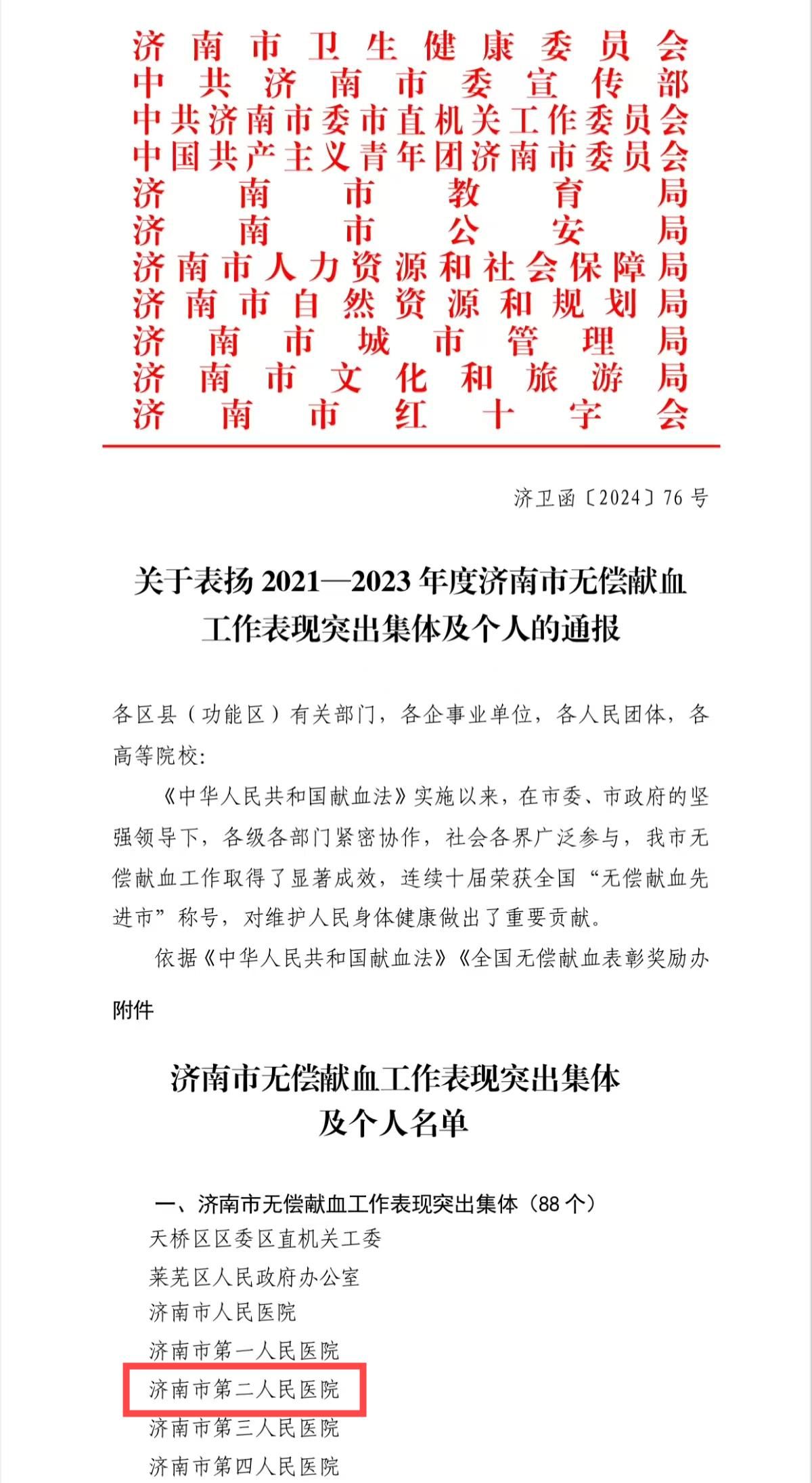 为表扬先进、树立榜样,推动无偿献血事业的持续健康发展,济南市卫生健康委员会、中共济南市委宣传部等十一部门联合发布《关于表扬 2021—2023 年度济南市无偿献血工作表现突出集体及个人的通报》,云顶赌场