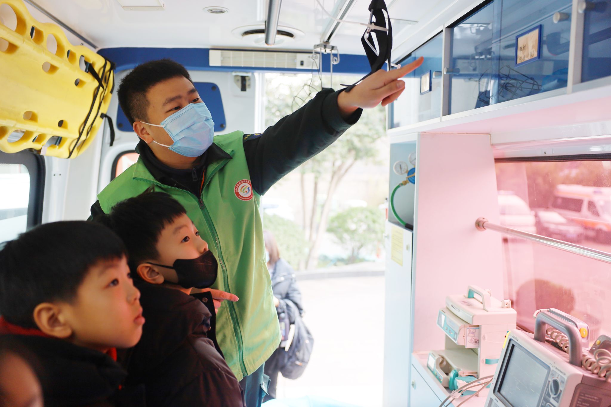 志愿者为小朋友讲解急救车内的设备