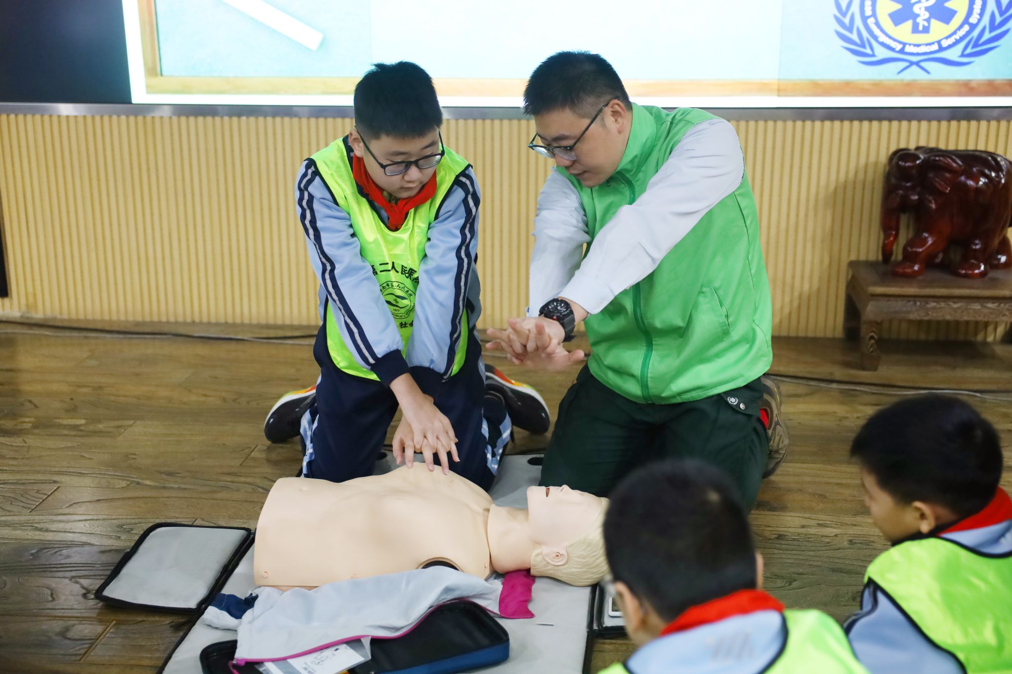 志愿者指导小朋友进行心肺复苏