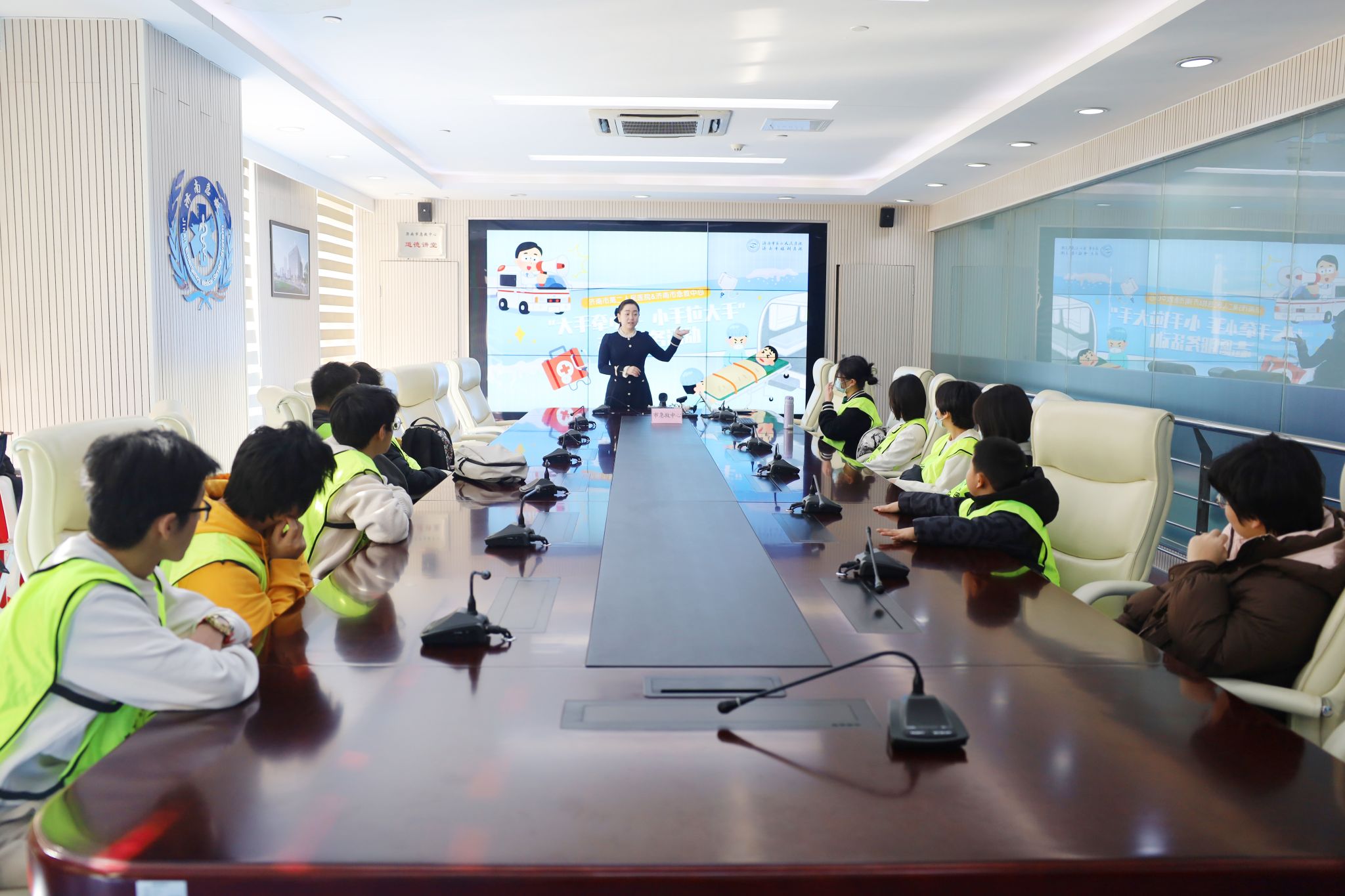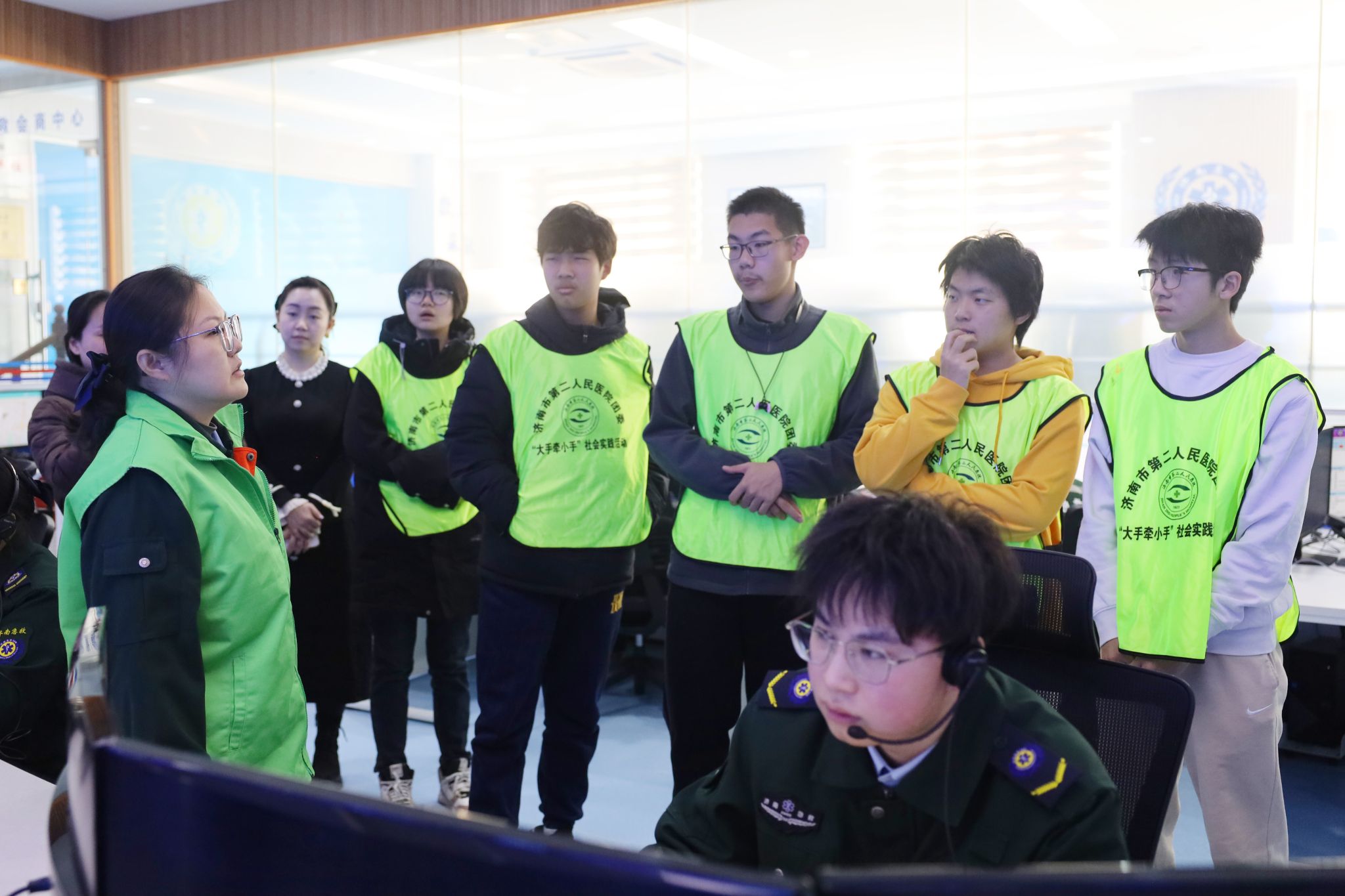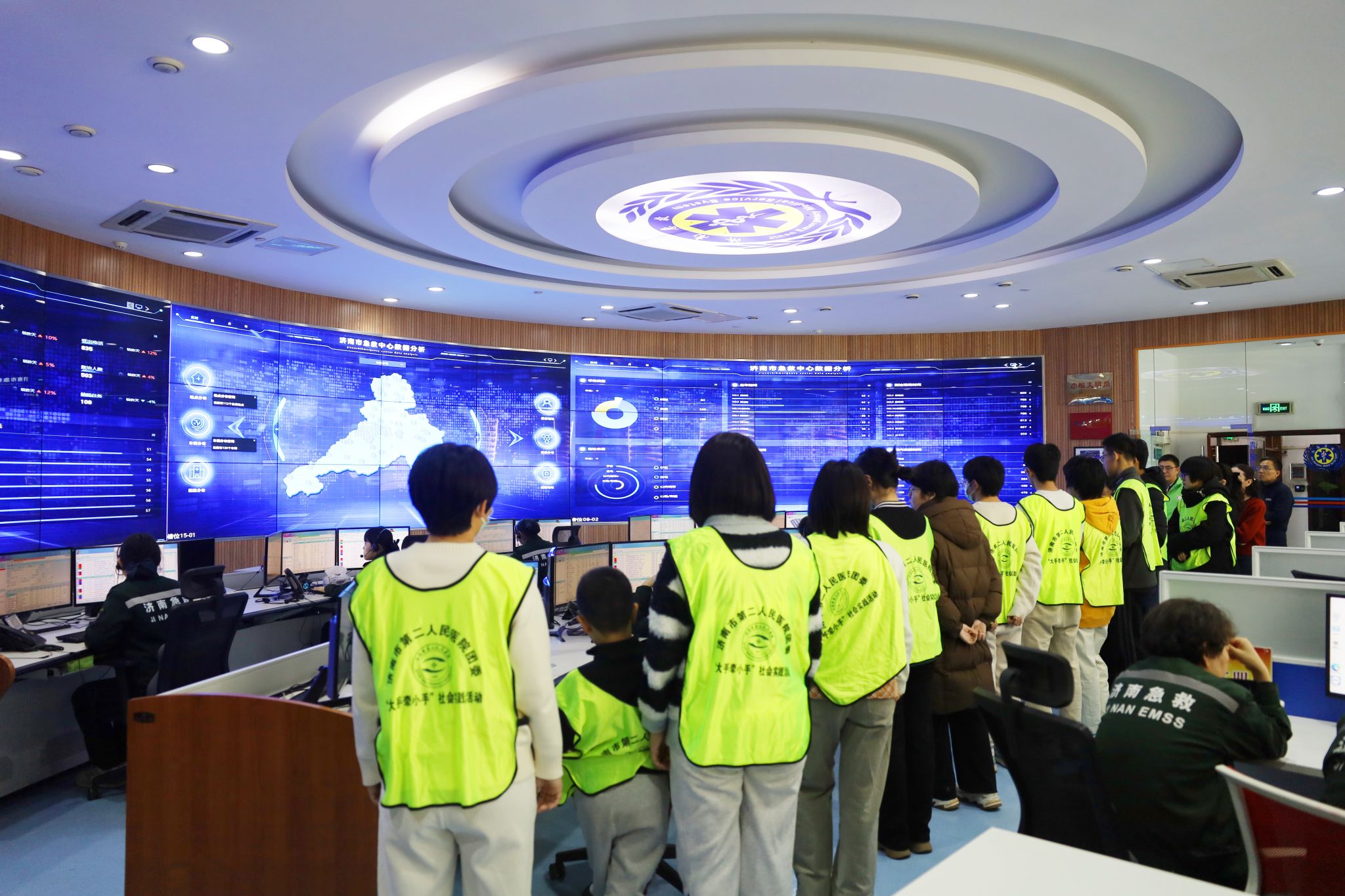讲座结束后,学生们走进了济南市120指挥中心进行参观。在指挥中心,工作人员向他们详细介绍了120急救系统的运作机制,包括如何接听报警电话、如何调度急救车辆、如何协调各方资源进行紧急救援等。孩子们通过现场接话员们紧急又条理的语言和大屏幕上一个个代表急救车的标志飞速驶向需要救助的地点,纷纷表示感受到了急救工作的重要性和紧迫性。