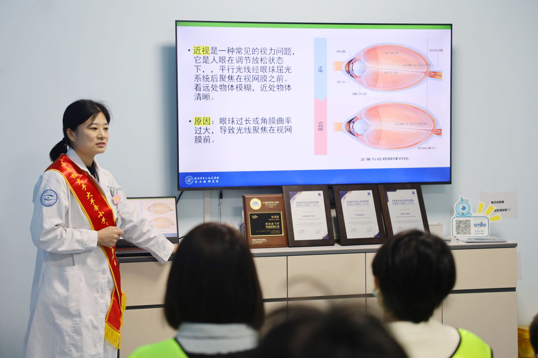 随后,在志愿者们的引领下,学生们来到市眼科医院(市二院)屈光手术中心。在这里,中心的手术护士为青少年们带来了一场关于屈光手术的精彩讲座。讲座从屈光手术的基本原理讲起,详细介绍了手术的适应症、手术前后的注意事项以及手术风险与预防措施。讲座结束后,青少年们还亲身体验了视力检测和验光的过程,并学习了如何认识和解读验光单。