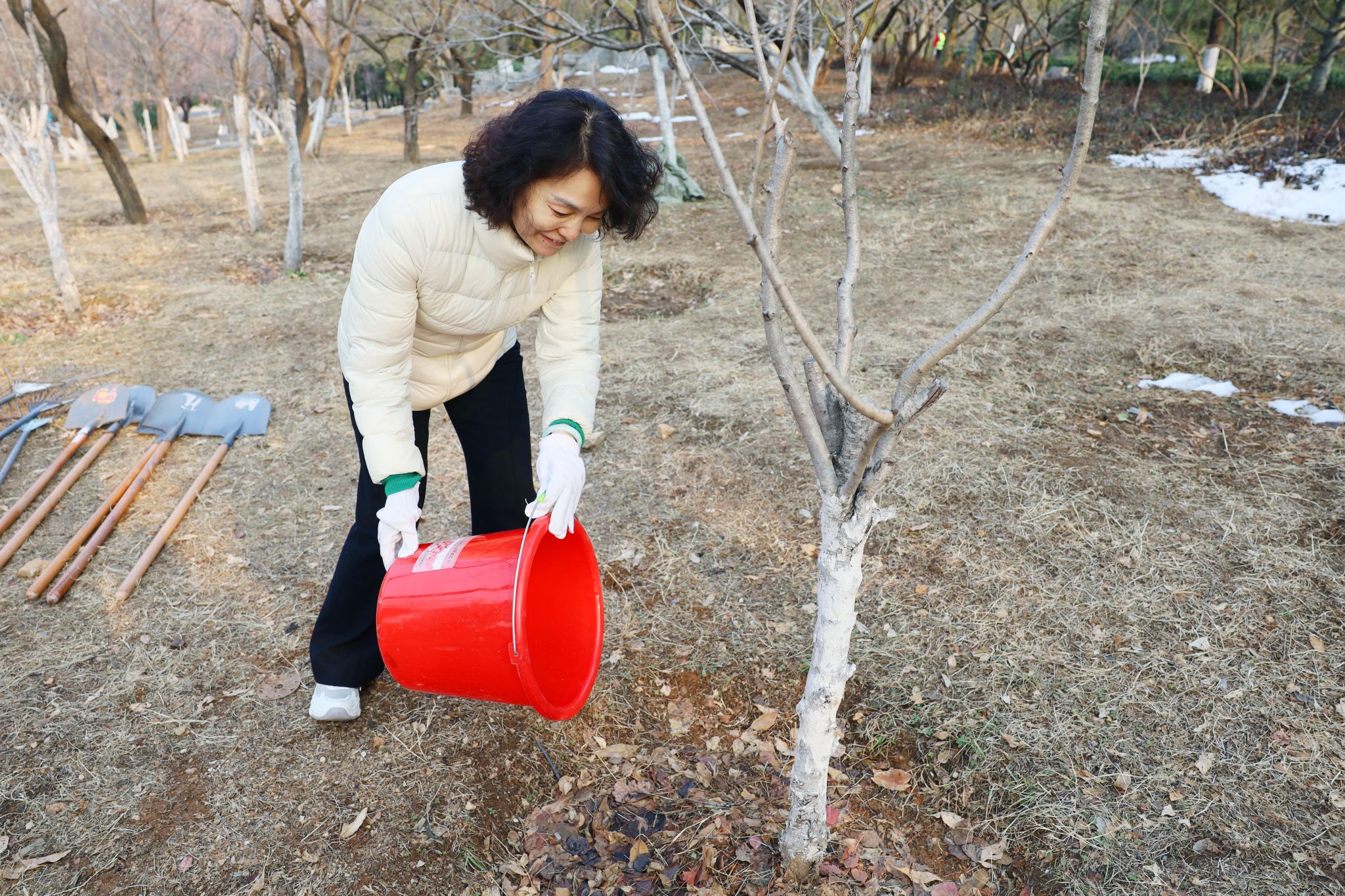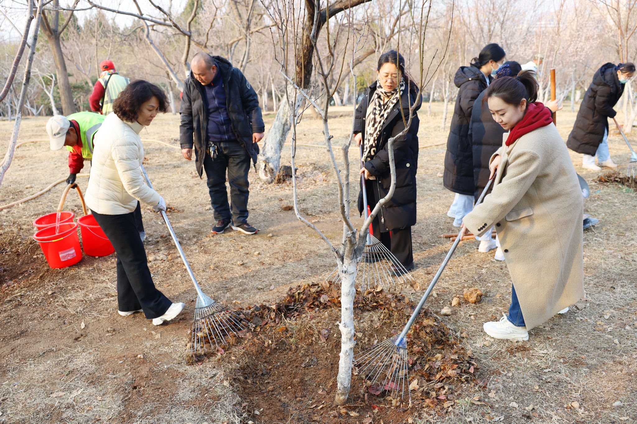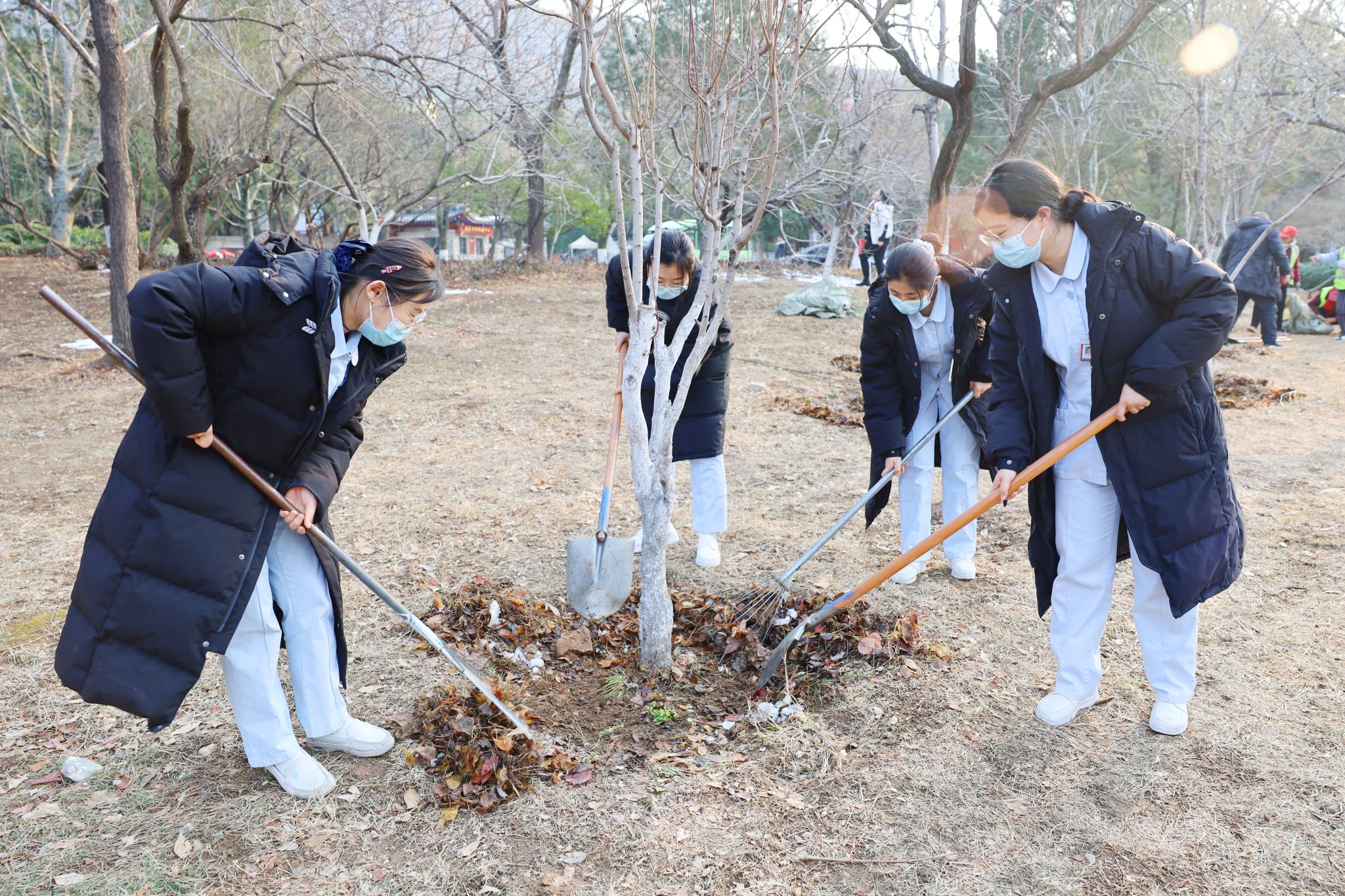 活动开始,在景区管理人员的指导下,大家了解了什么是浇春水。浇春水也叫春灌,春季是万物生长的重要时期,此时进行适量的灌溉有助于植物的生长和发育。医院青年迅速分组并投入到紧张的春灌工作中。值得一提的是,青年职工们细心发现每棵树坑内都堆有大量的树叶,在浇水之前工作人员都先将树叶用耙子耙出,这一行为引起了青年人的好奇。工作人员介绍到,这些树叶是冬天来临前特意给每棵树盖上的,作为覆盖物铺在树根部,这有助于冬季保持土壤湿度,减少水分蒸发,随着时间的推移,树叶会逐渐分解并融入土壤中,为植物提供养分。也有部分树叶没有分解,在浇春水之前,要将树根周围的树叶耙掉,这有助于确保水分能够直接渗透到土壤中,而不是被树叶阻挡在表面,从而确保每一棵树木都能得到充足的水分滋养,为即将到来的生长旺季打下坚实基础。
