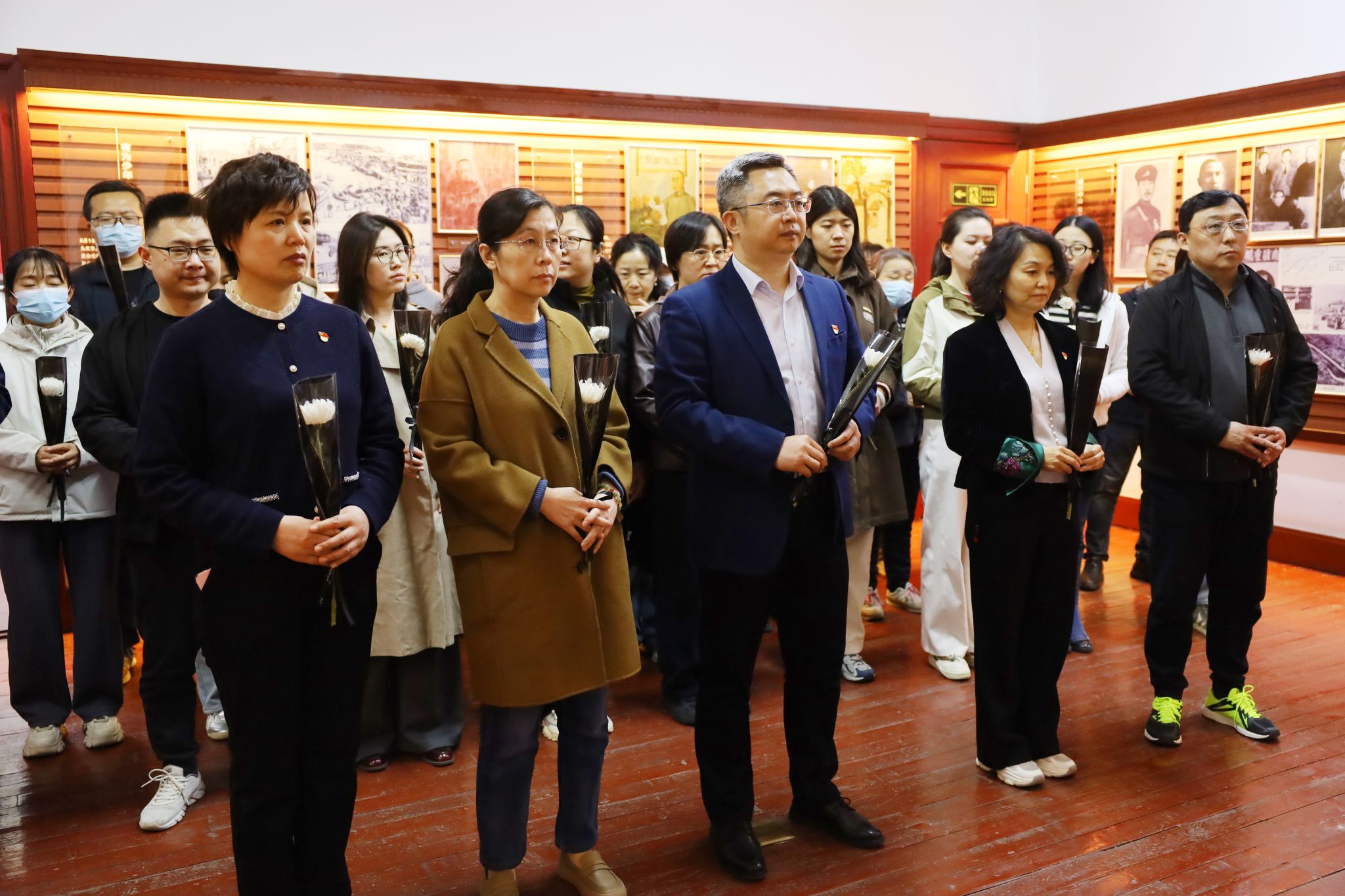 观看纪录片结束后,全体人员在纪念馆展厅庄严肃立,向革命先烈蔡公时先生铜像敬献花束。