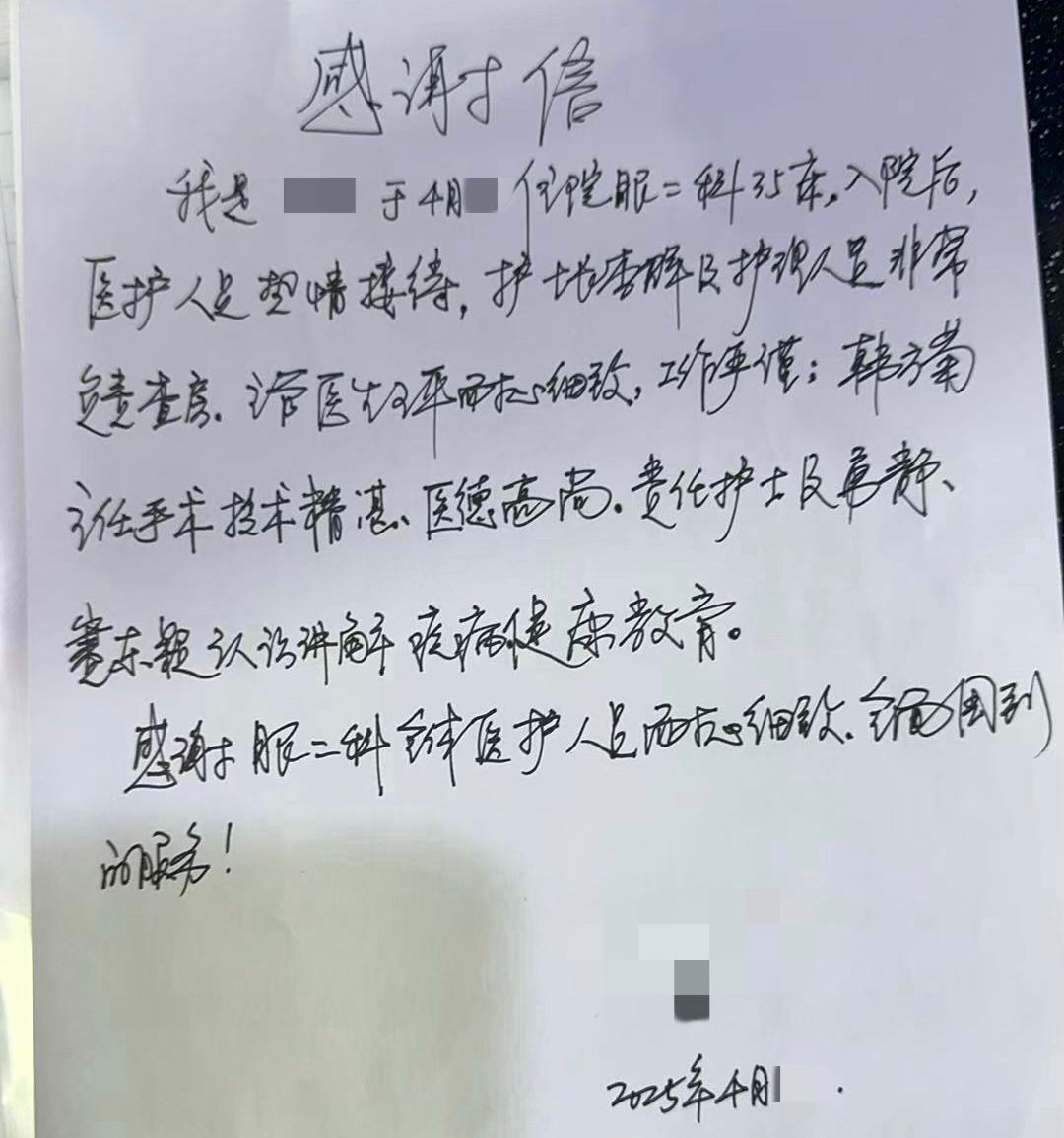 在感谢信中,孙先生高度赞扬了眼二科团队精湛的医术,高尚的医德,耐心细致、全面周到的服务。未来,市眼科医院(市二院)今后将继续以患者为中心,用精湛医术和暖心服务,为更多眼疾患者带来光明与希望。(眼二科 李文静 孟德铃)