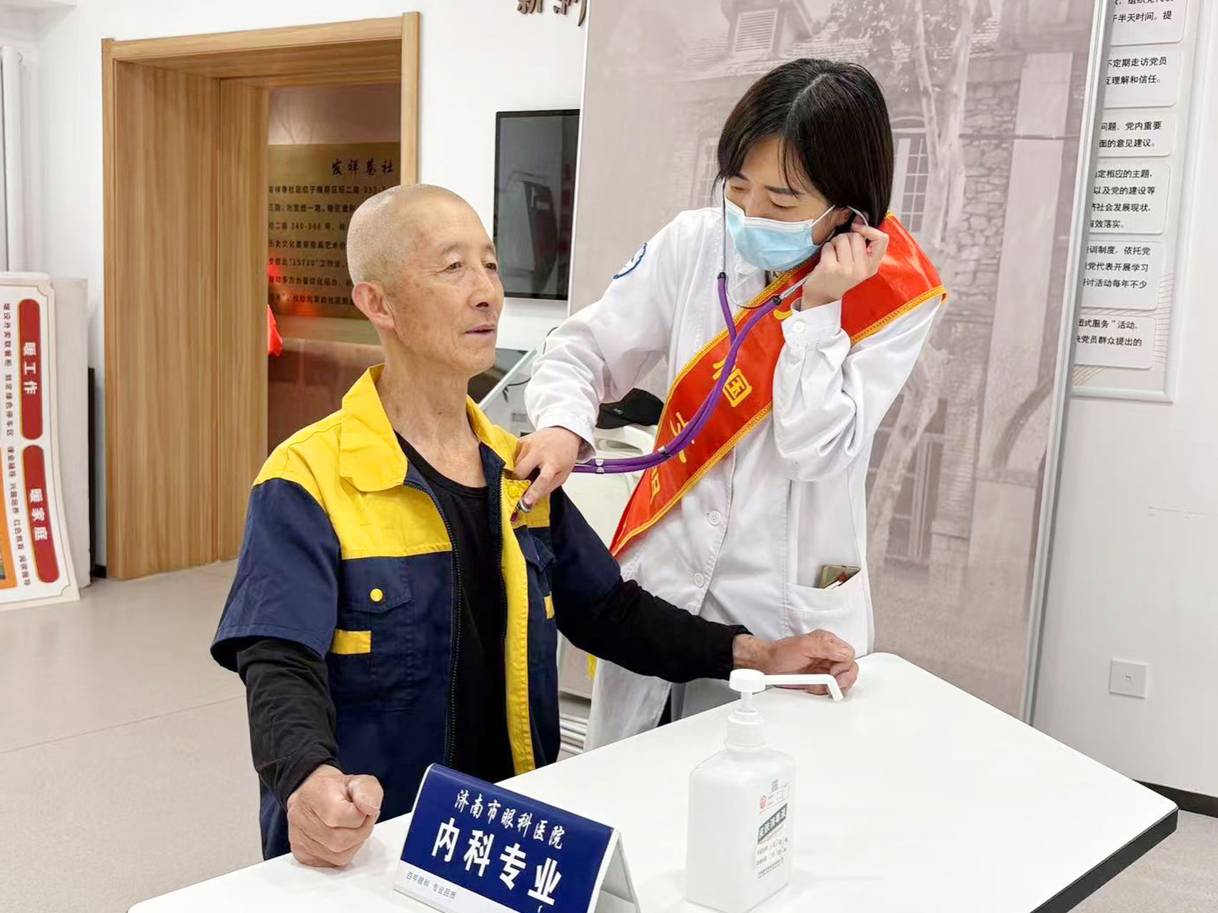 )内科医疗团队走进五里沟街道发祥巷小区,面向外卖员与社区居民开展爱心义诊活动。