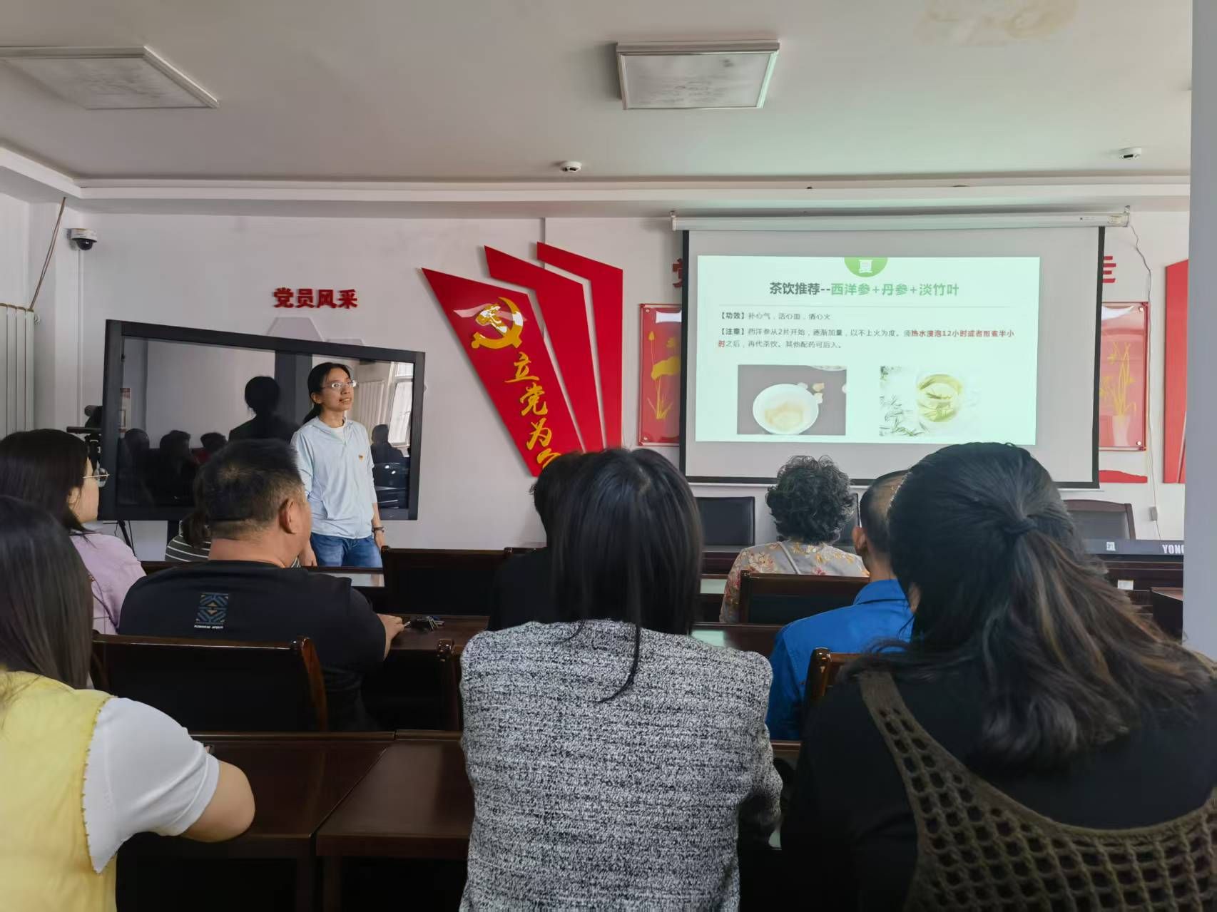 讲座中,来自医院药学部中药房的党员王婷以通俗易懂的语言和生动形象的比喻,向社区居民详细讲解了四季养生的要点。她结合中医理论,从春季养肝、夏季养心脾、秋季润肺到冬季补肾,为居民们提供了实用的饮食建议和养生方法。此外,王婷还分享了多道适合不同季节的养生食谱,如枸杞菊花茶、冬瓜薏米老鸭汤等,帮助居民在日常生活中轻松实践养生之道。