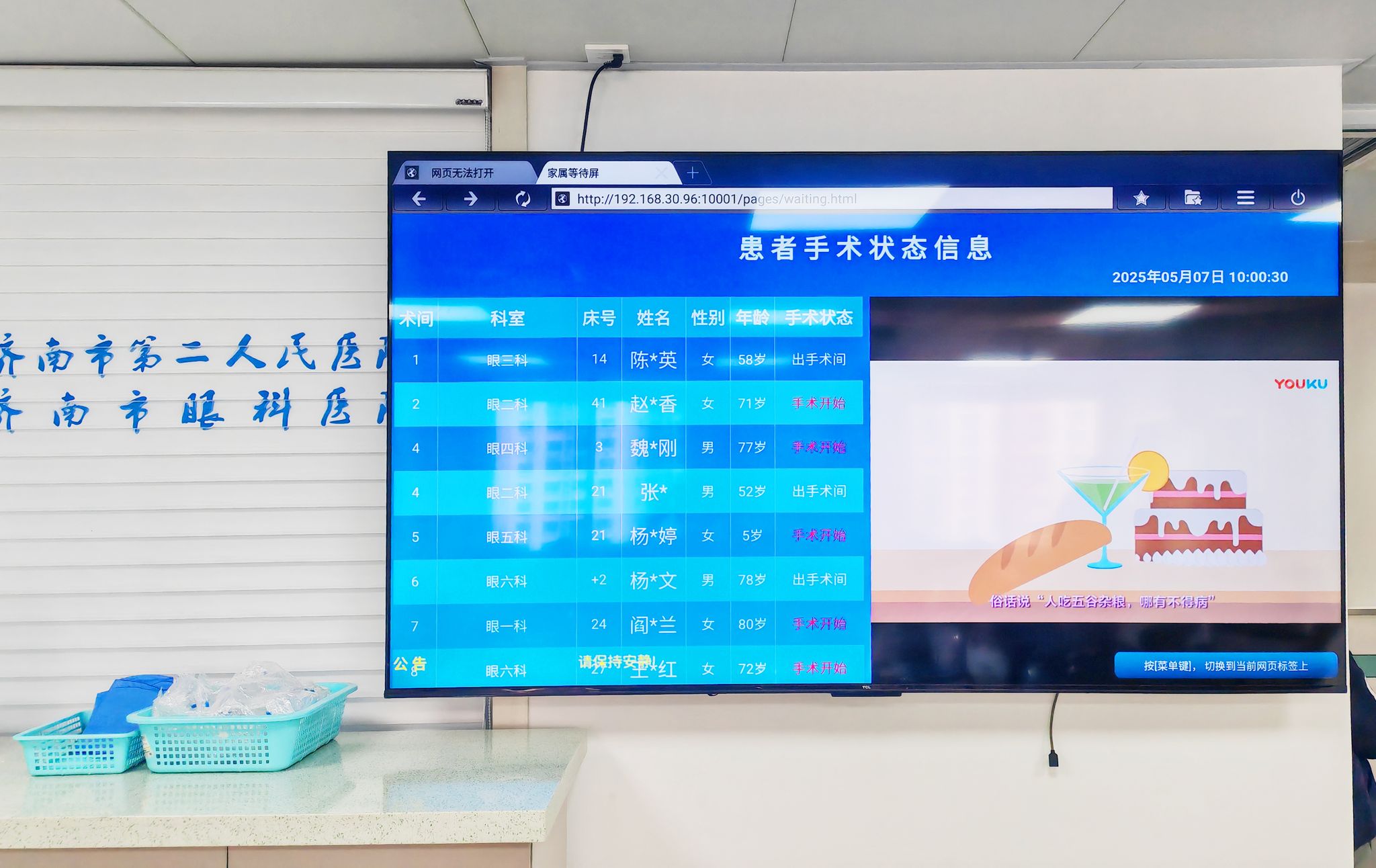 在病人等待区中央,一块高清LED大屏幕明亮醒目,为焦急守候的家属们搭建起与手术室内亲人“无声相连”的桥梁。屏幕采用分栏式设计,屏幕左侧滚动播放着手术患者的姓名、年龄、手术状态等基础信息,并对患者重要信息进行遮盖,家属们无需反复询问,便能清晰掌握亲人手术进展。屏幕右侧嵌入温馨提示板块,循环播放术后护理知识、探视注意事项等内容,既缓解家属等待时的焦虑,也为后续照护提供实用指导。整个大屏幕设计简洁明了、信息更新及时,让每一位等待的家属吃下“定心丸”,在透明化、人性化的服务中感受到医院的专业与温度。
