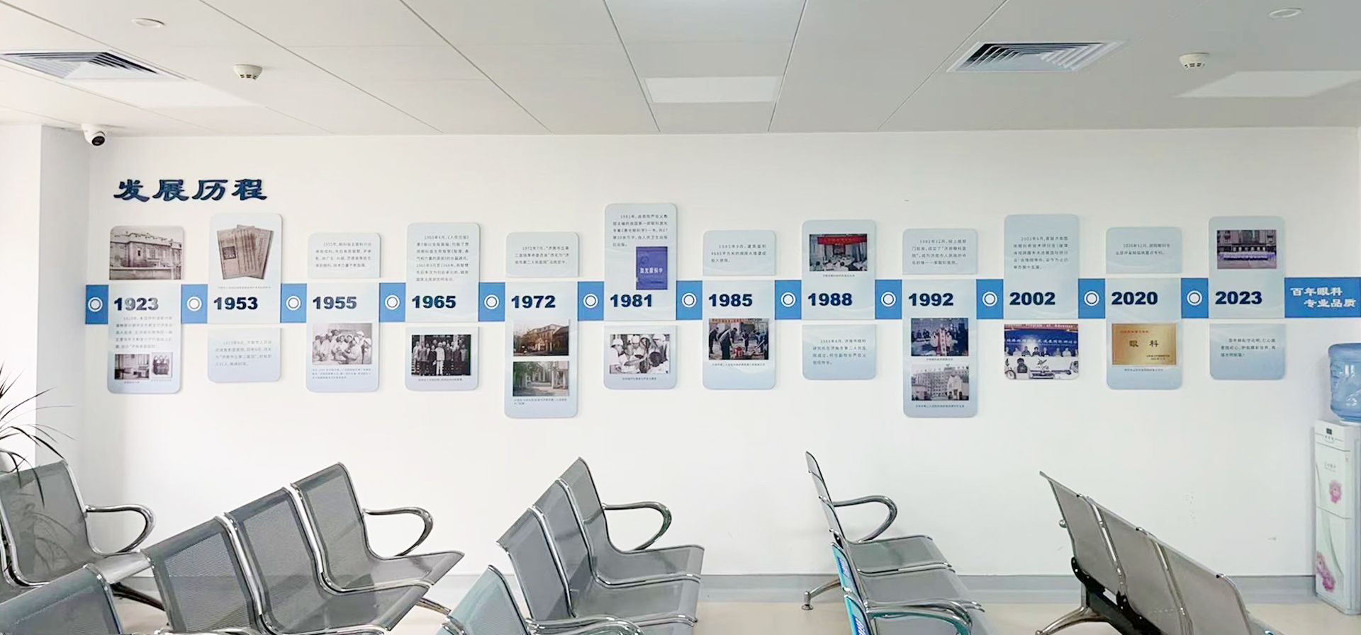 整面墙通过模块化设计,划分成多个主题区域。左侧是医院发展历程板块,墙上镌刻着医院自1923年创立直至2023年的壮阔发展历程,将百年风雨兼程中的艰辛探索、创新突破与荣耀时刻一一呈现,凝聚着一代代医者的心血与坚守,见证着医院一路成长的坚实足迹。